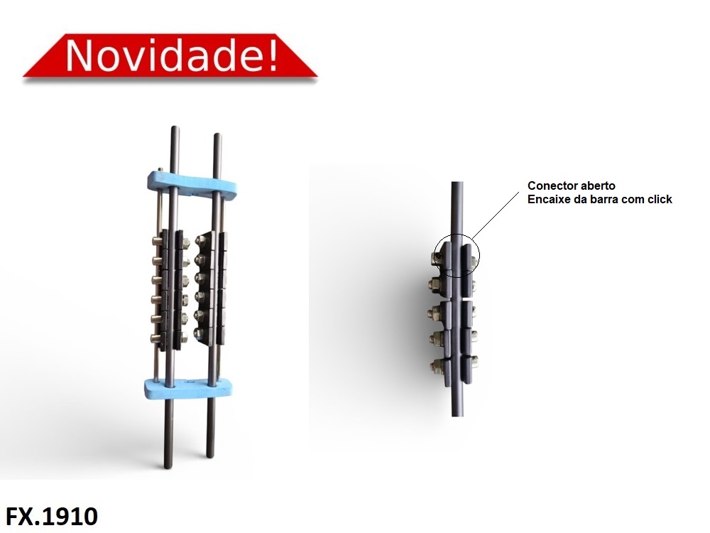 Este fixador possui 12 conectores que facilitam a conexão com as barras permitindo uma rápida fixação com duas barras longitudinais e duas barras transversais.
